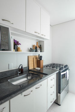 esse é um apartamento alugado, o que significa que precisamos trabalhar levando em consideração todos os acabamentos existentes, como o piso laminado, as bancadas entregues pela construtora e a marcenaria convencional.